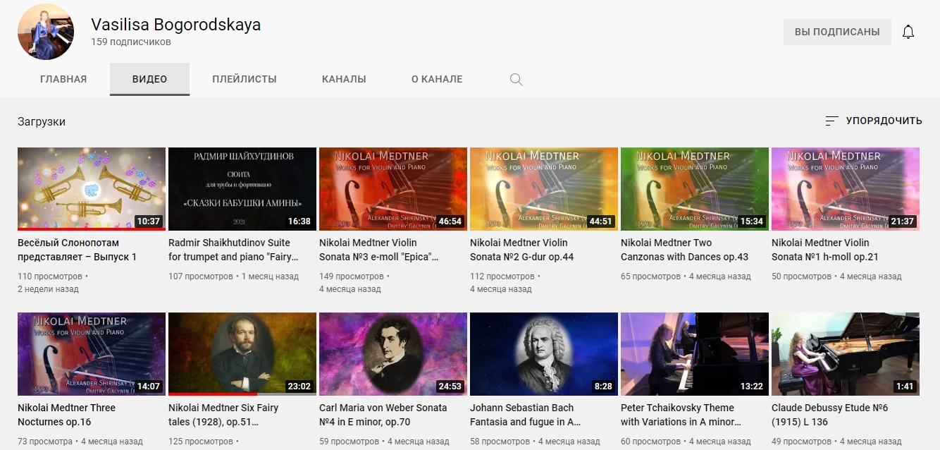 In addition to videos with solo performances, the channel presents performances in collaboration with various musicians – instrumentalists and vocalists. And also periodically there are films about composers, performers and musical events. Recently, a new column “Merry Heffalump” has been opened, dedicated to novice musicians.
